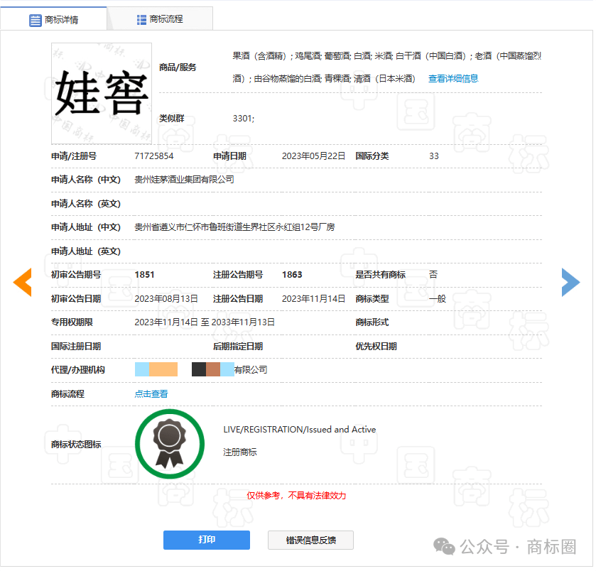 巨商科技办事无限公司(巨商网)成立于2019年,贵州娃茅酒业集团无限公司已申请注册“娃窖”商标,