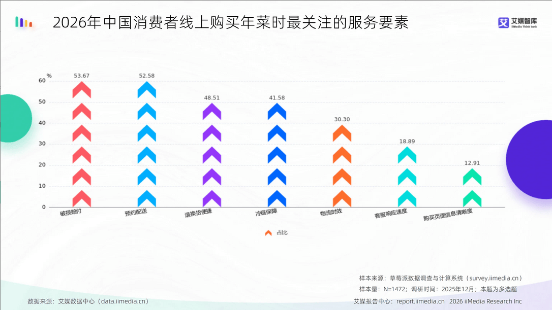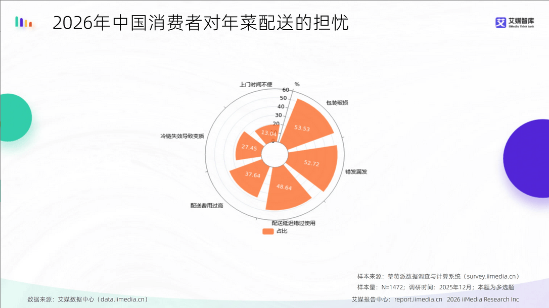 2026年中国年菜行业市场规模为2626.40亿元,满减、新人专享等促销体例吸引力相对无限。次要集中正在包拆破损(53.53%)、错发漏发(52.72%)及配送延迟错过利用(48.64%)三方面。